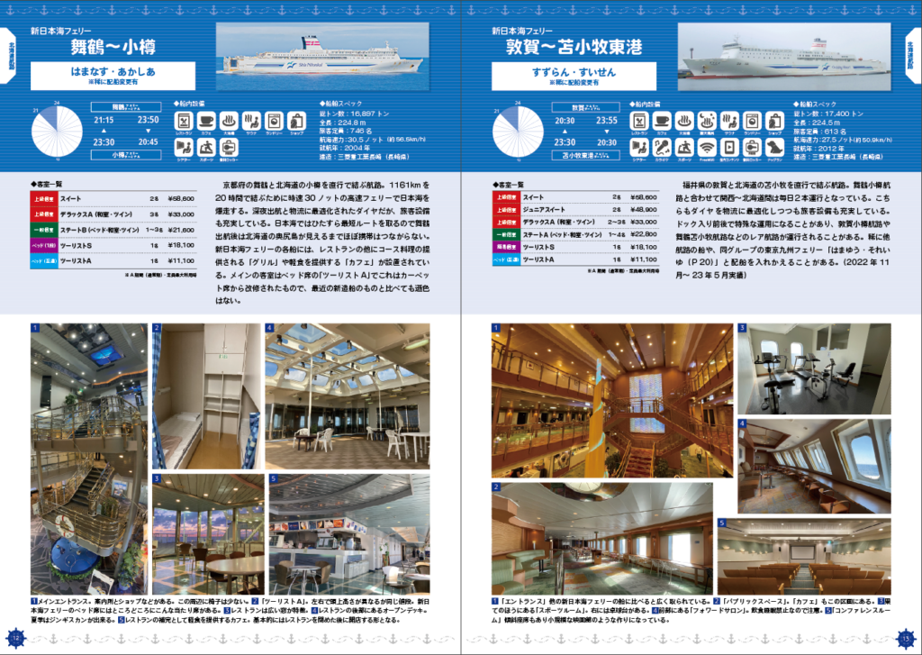 B5からA5へと一回り小さくはなりましたが、各フェリーの紹介は1/2Pから1Pに広がったため情報量は増えています。積極的に載せていなかった運賃情報も今回は思い切って載せています。