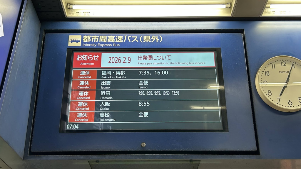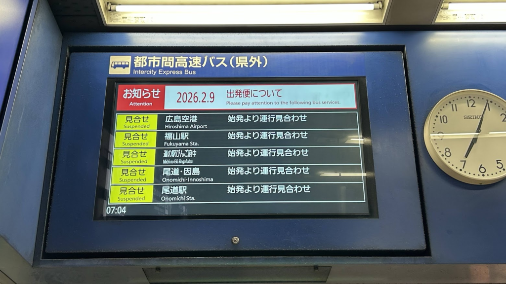 昨日の夜行バスが運休したので、改めて広島バスセンター7時35分発の高速バスを取り直している。