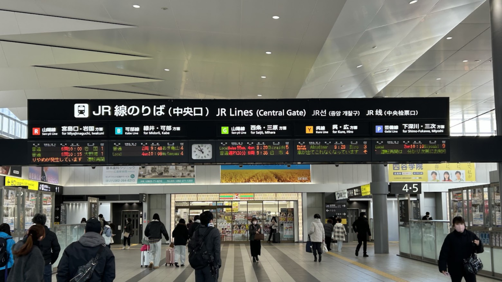 この後岩国行きに乗るために1番のりばへ行き待っていると、唐突に2番のりばからになりますアナウンスがあり民族大移動。1050にようやくやってきた岩国行きに乗って一息ついていたが、全然発車する気配がない。そのうち1番のりばの五日市行きが先に出発しますとのアナウンスがあり近場の人が一斉に移動。